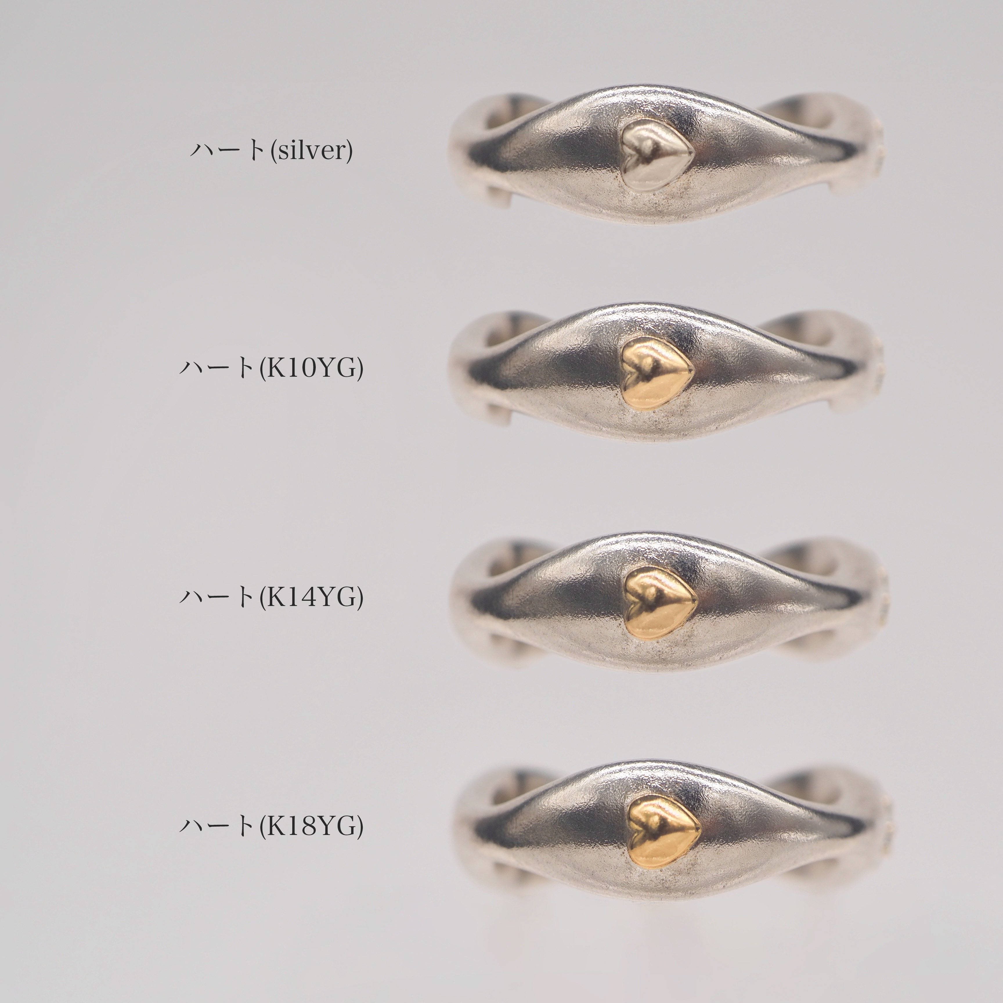 ・ハート:「SILVER925」or「K10YG(金41.6%、銀34.8%、銅23.2%)」or「K14YG:金58.33%、銀・銅41.66%」or「K18YG(金75%、銀15%、銅10%) 」
