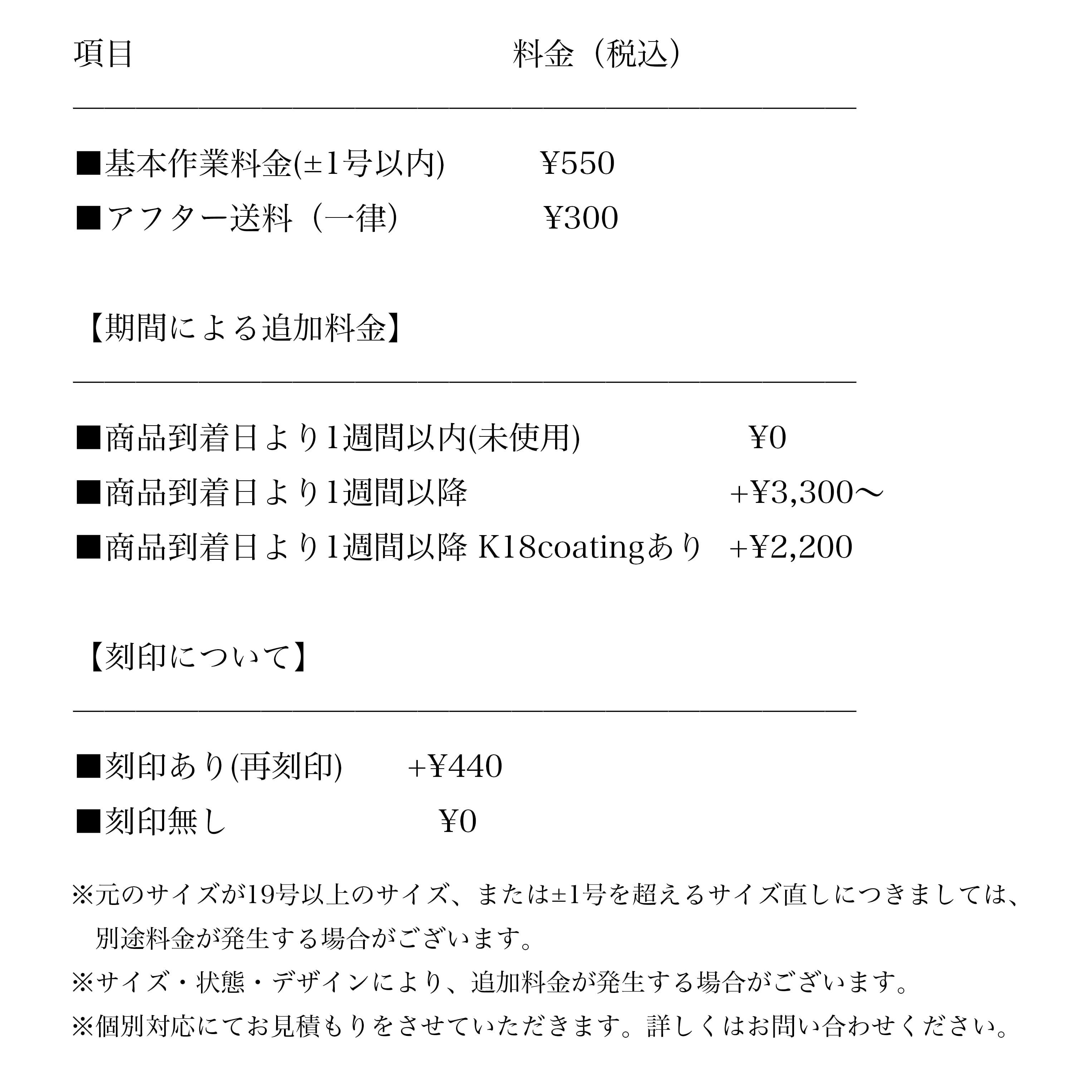 ※刻印の入ったjewelryのサイズ交換の際、再度刻印させていただくため、オプションとして刻印代を頂戴いたします。予めご了承ください。