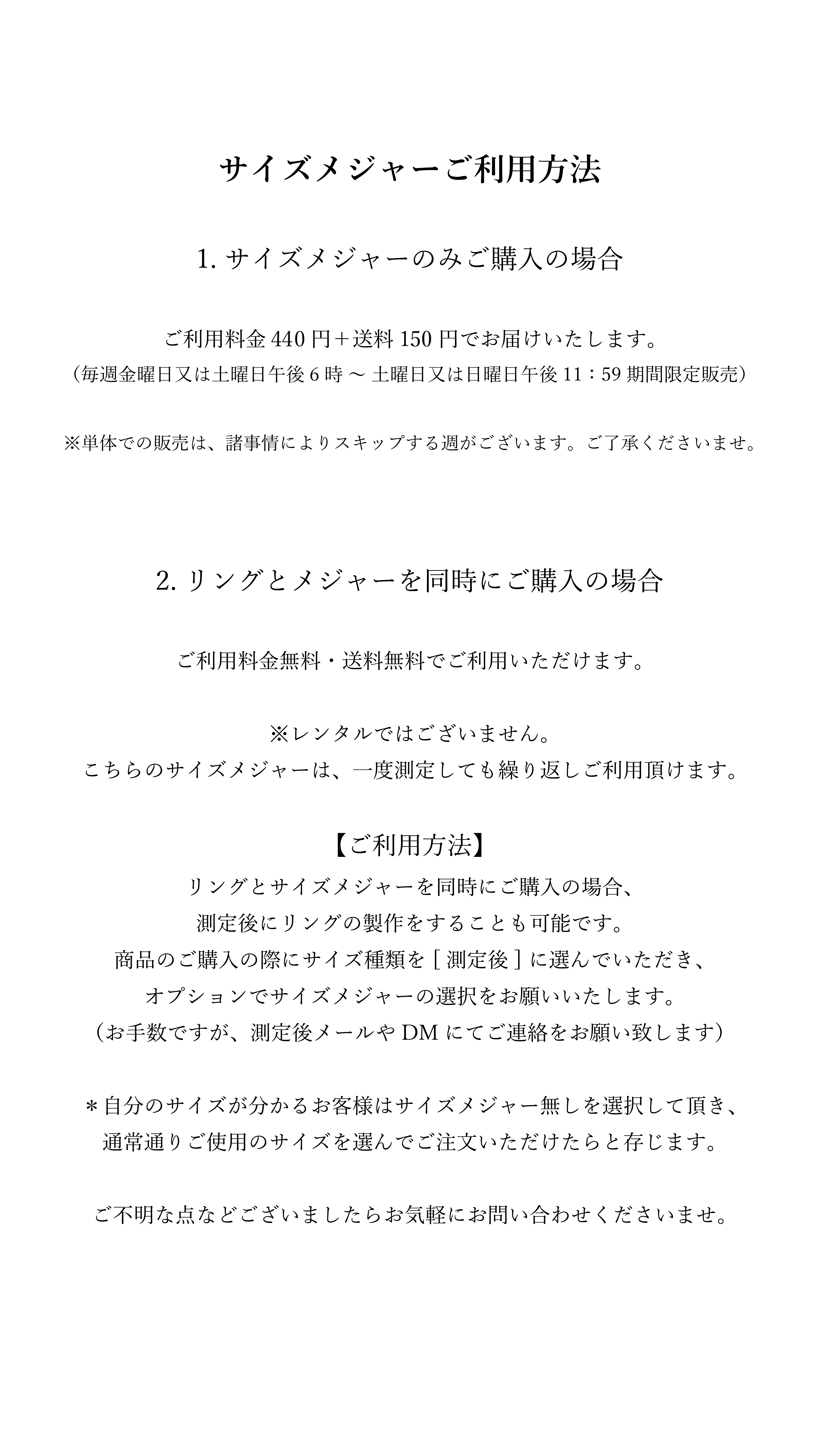 *リングとサイズメジャーを同時にご購入の場合:サイズメジャーをご希望のお客様は、商品のご購入の際にサイズ種類を [測定後] に選んでいただき、オプションでサイズメジャーの選択をお願いいたします。(無料でサイズメジャーをご利用いただけます)