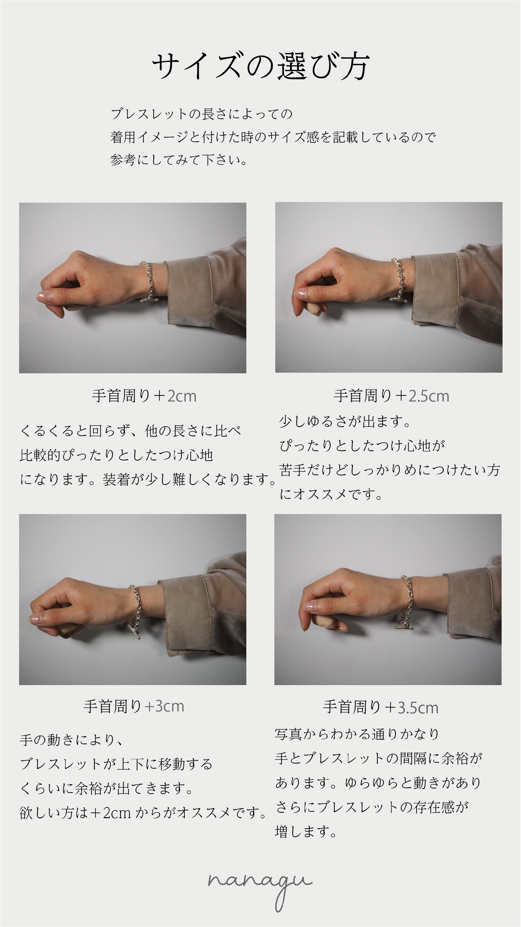 *選択欄以外の長さをご希望の方:お客様の手首のサイズとプラスするご希望の長さをお選びいただき、お客様の手首のサイズは備考欄へご記入ください。
